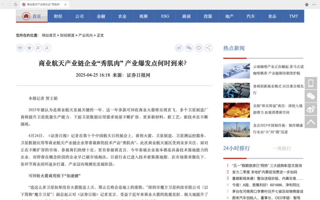 在本届“中国航天日”活动期间,作为商业航天产业链整合者,中科星图及各赛道公司凭借在商业航天领域创新成果,获得央视、北京卫视、三沙卫视,以及上海证券报、证券日报、无锡日报等众多媒体的广泛关注与报道,吸引了社会各界对中科星图发展的高度关注。
